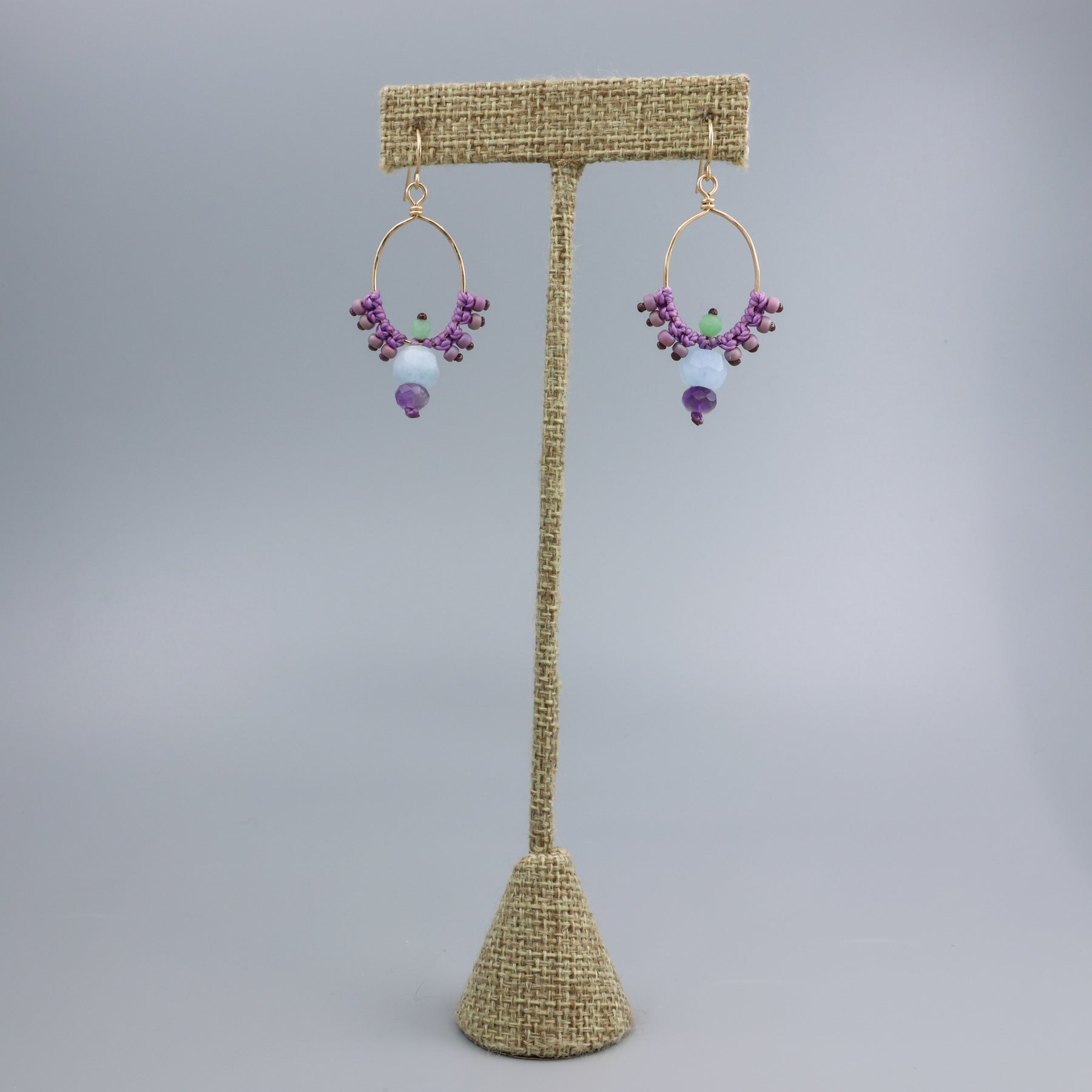 Embrace the spirit of nature with these striking Thunderbird Hoop Earrings, where artisanal macrame work meets the serene energy of aquamarine and amethyst gemstones. Each pair is thoughtfully handcrafted and suspended from hand-formed gold-filled hoops, creating an effortless blend of bohemian charm and refined elegance. The soft, lightweight design makes them perfect for all-day wear, while the vibrant stone palette evokes the peaceful beauty of a mountain landscape in full bloom. Let these meaningful pieces remind you of your own inner strength and natural grace.