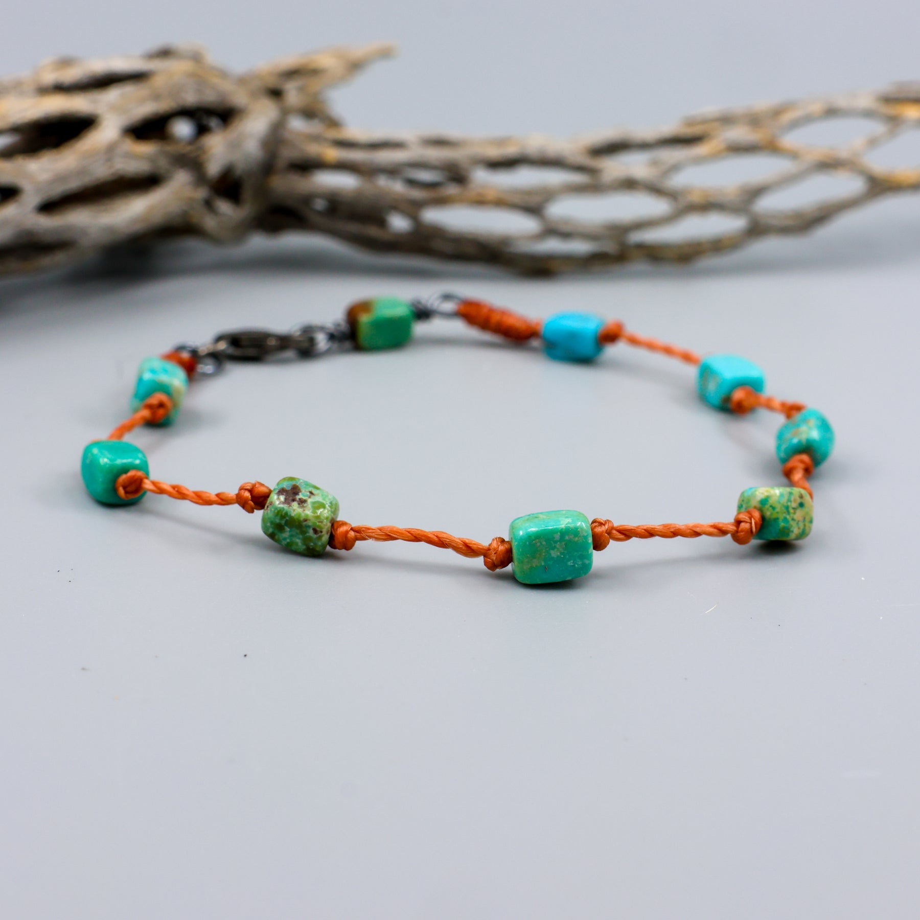 Small rectangular turquoise beads strung on a warm terracotta cord create an understated elegance that works beautifully on its own or layered with other pieces. Each bracelet is hand-knotted with care, ensuring durability and a personal touch that mass-produced jewelry simply can't match. The oxidized sterling silver clasp adds a sophisticated contrast to the natural stone and earthy tones, giving this piece a refined, artisanal quality. Whether you're drawn to turquoise for its calming energy or simply love its rich blue-green hue, this minimalist design celebrates the stone's natural beauty without unnecessary embellishment. Perfect for everyday wear, it's a versatile addition to any jewelry collection that brings both style and substance to your personal aesthetic.