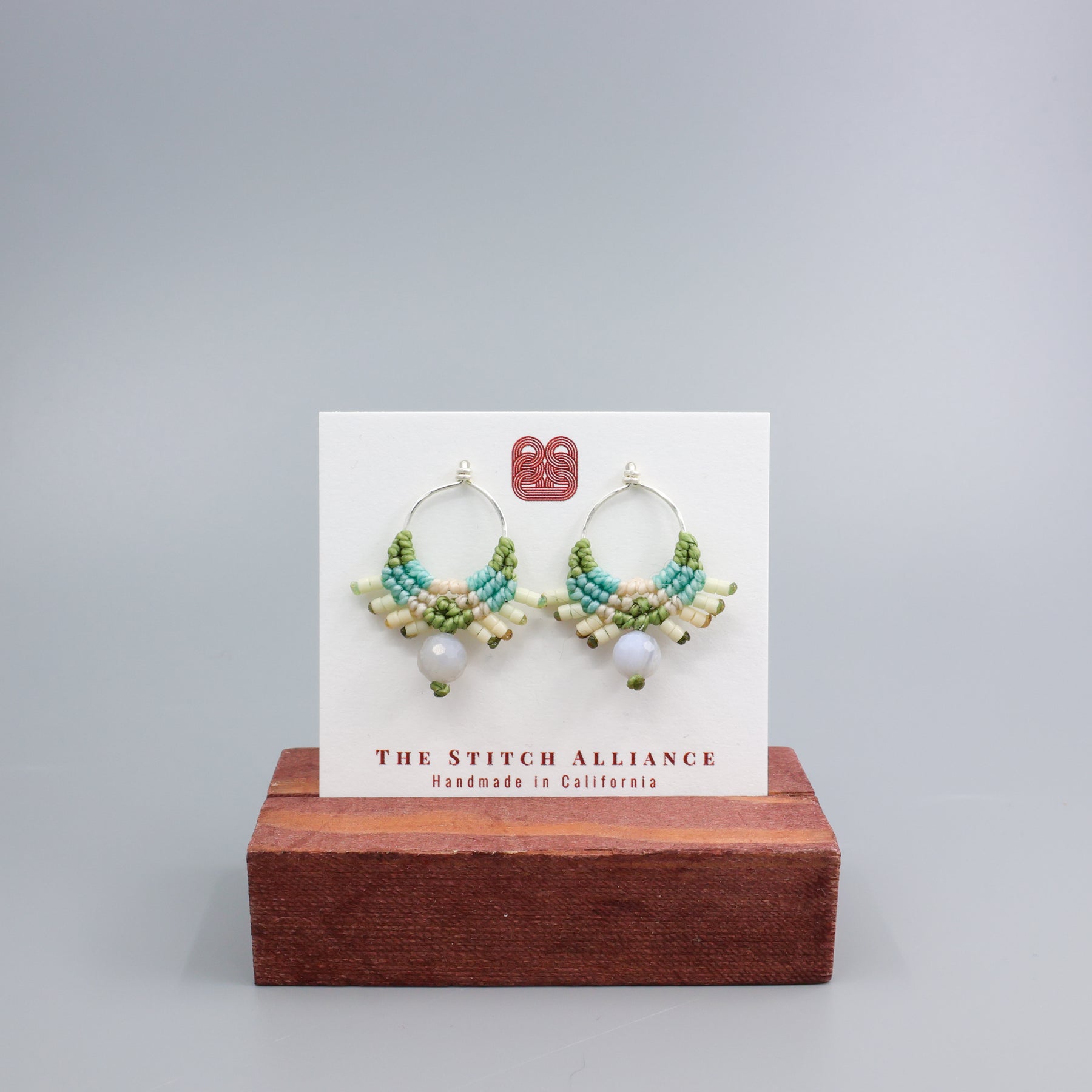 Elevate your style with these stunning sun circle macrame earrings. Meticulously crafted in blue and green and adorned with blue lace agate beads, these earrings are truly unique. The sterling silver wire and ivory seed beads add an elegant touch. Ideal for a sunny vacation, these post-style earrings will make you stand out from the crowd and evoke the refreshing colors of spring. Don't settle for anything less than extraordinary with these beautiful earrings.