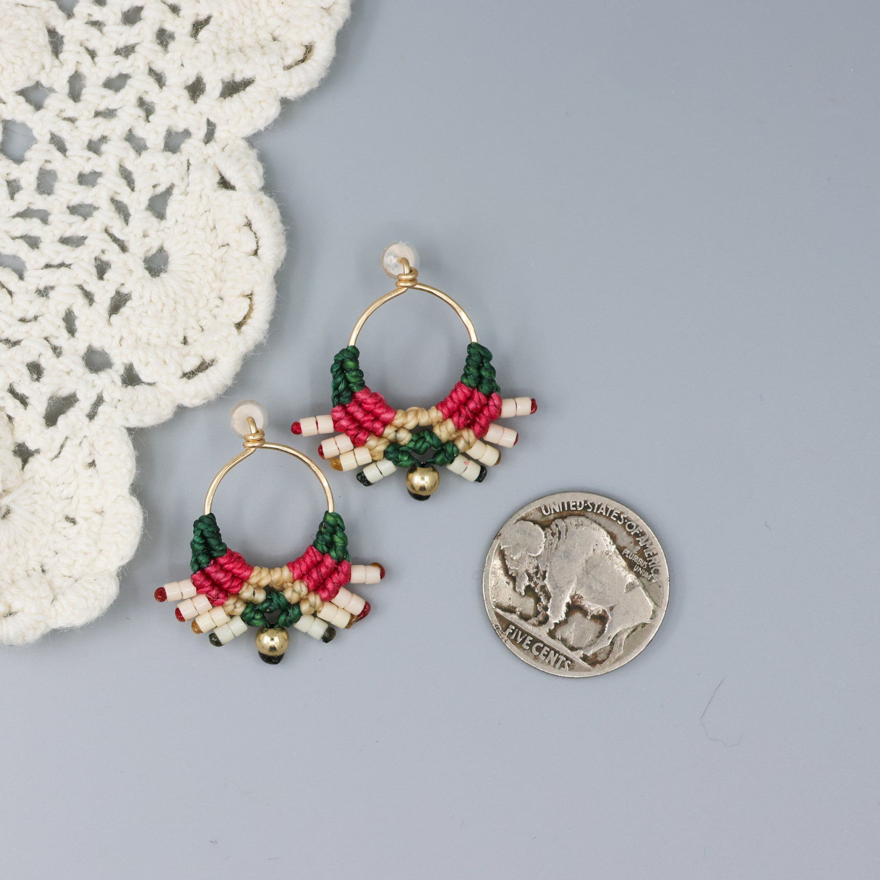 pink and green gold filled macrame earrings handmade with a nickel for size comparison