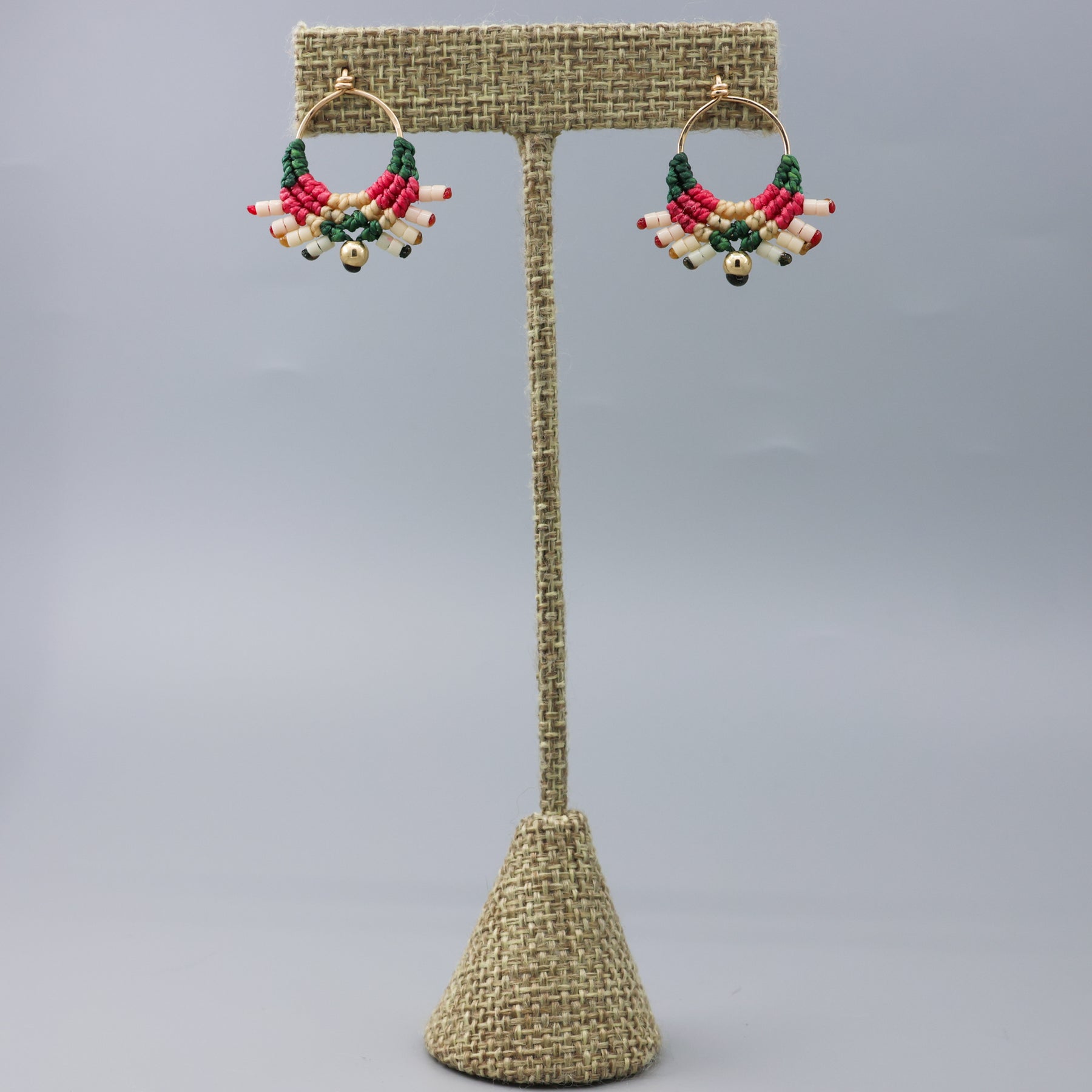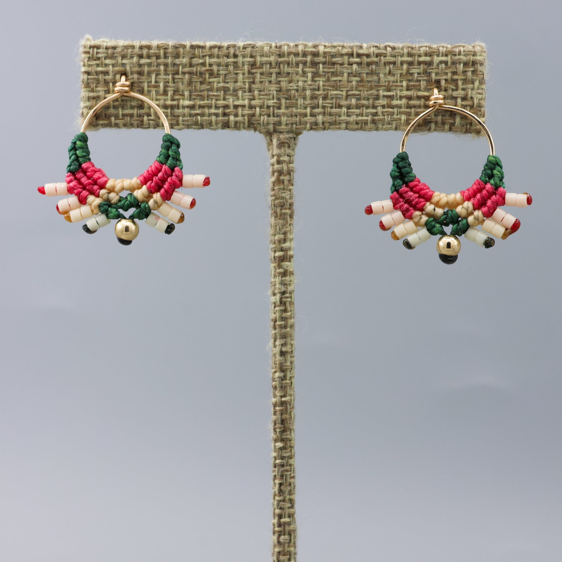 pink and green gold filled macrame earrings handmade on gray background