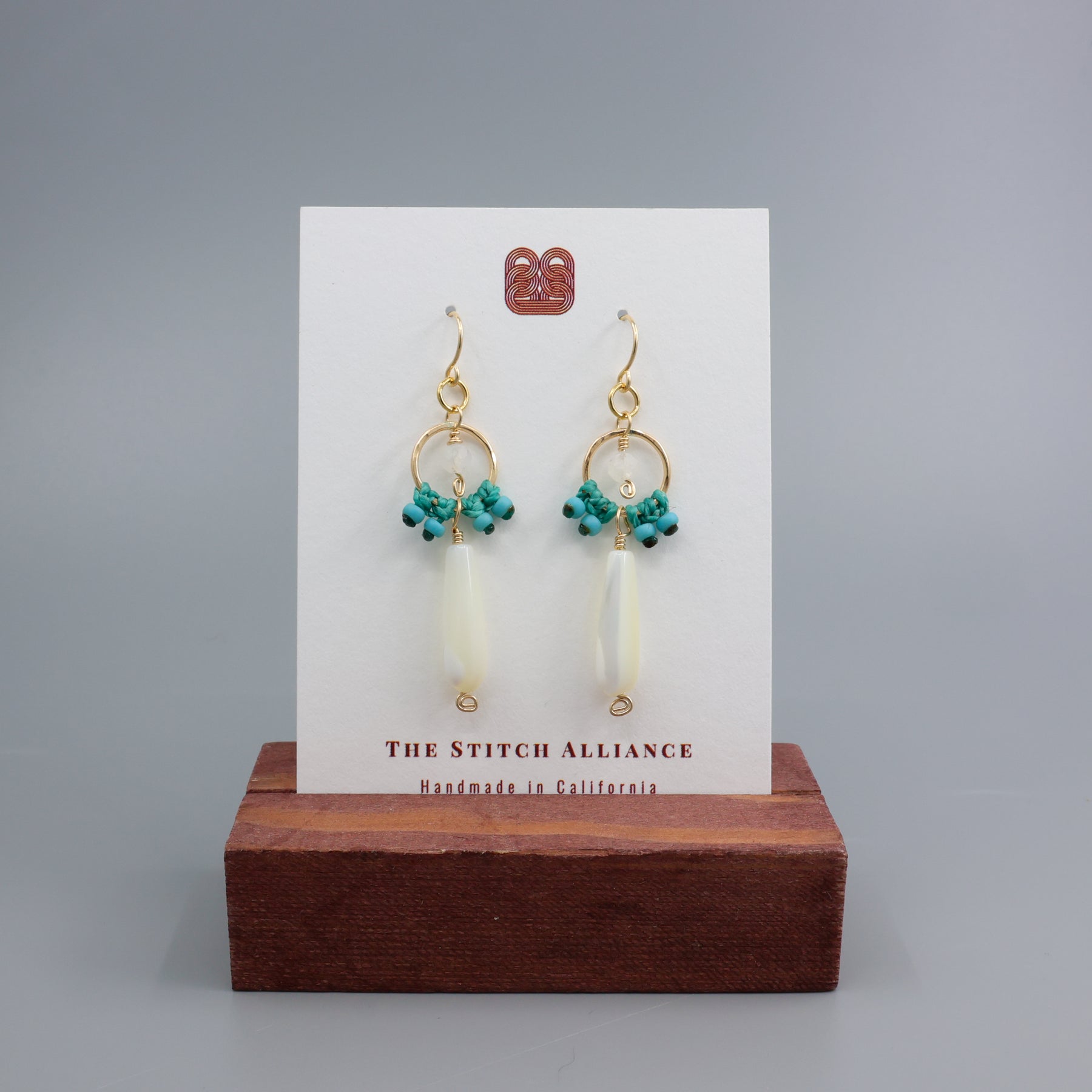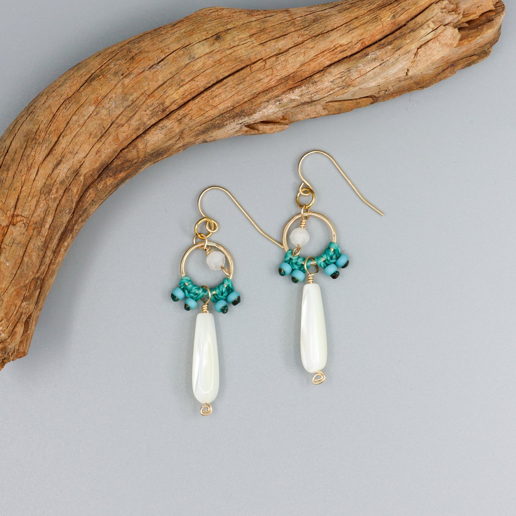 Make a graceful statement with the Maria earrings, designed to celebrate your unique style. These captivating mid-length dangles feature distressed gold-filled hoops that frame your face beautifully, while luminous mother of pearl teardrops and delicate rainbow moonstone beads create movement and sparkle. The soft blue-green macrame accent adds an artisanal charm that completes the piece. Whether you're dressing up or keeping it casual, these earrings bring warmth and character to any look.