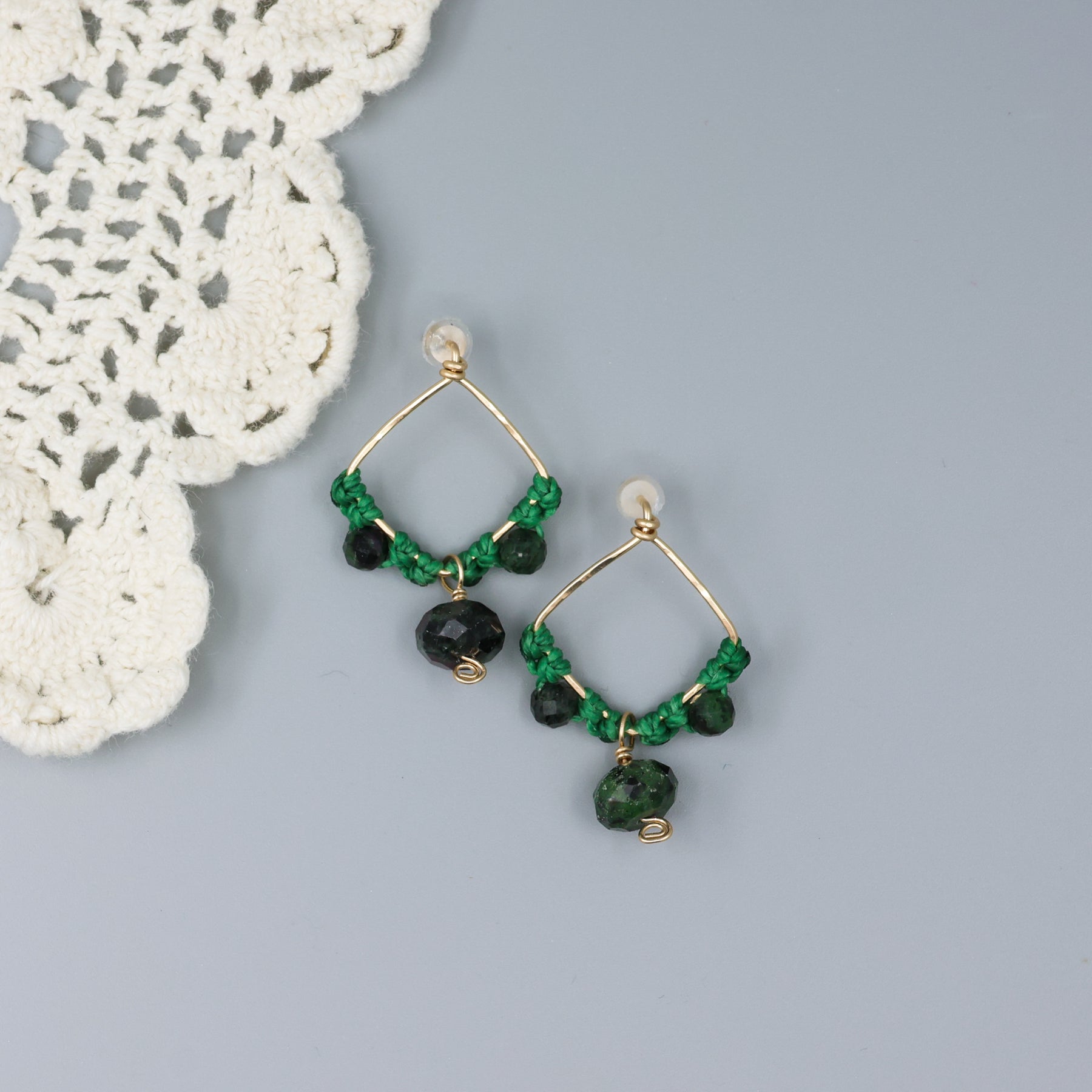 These boho drop earrings feature hand-formed diamond-shaped drop hoops with ruby in zoisite beads that sparkle with every movement. An additional bead dangles from the center for added charm.