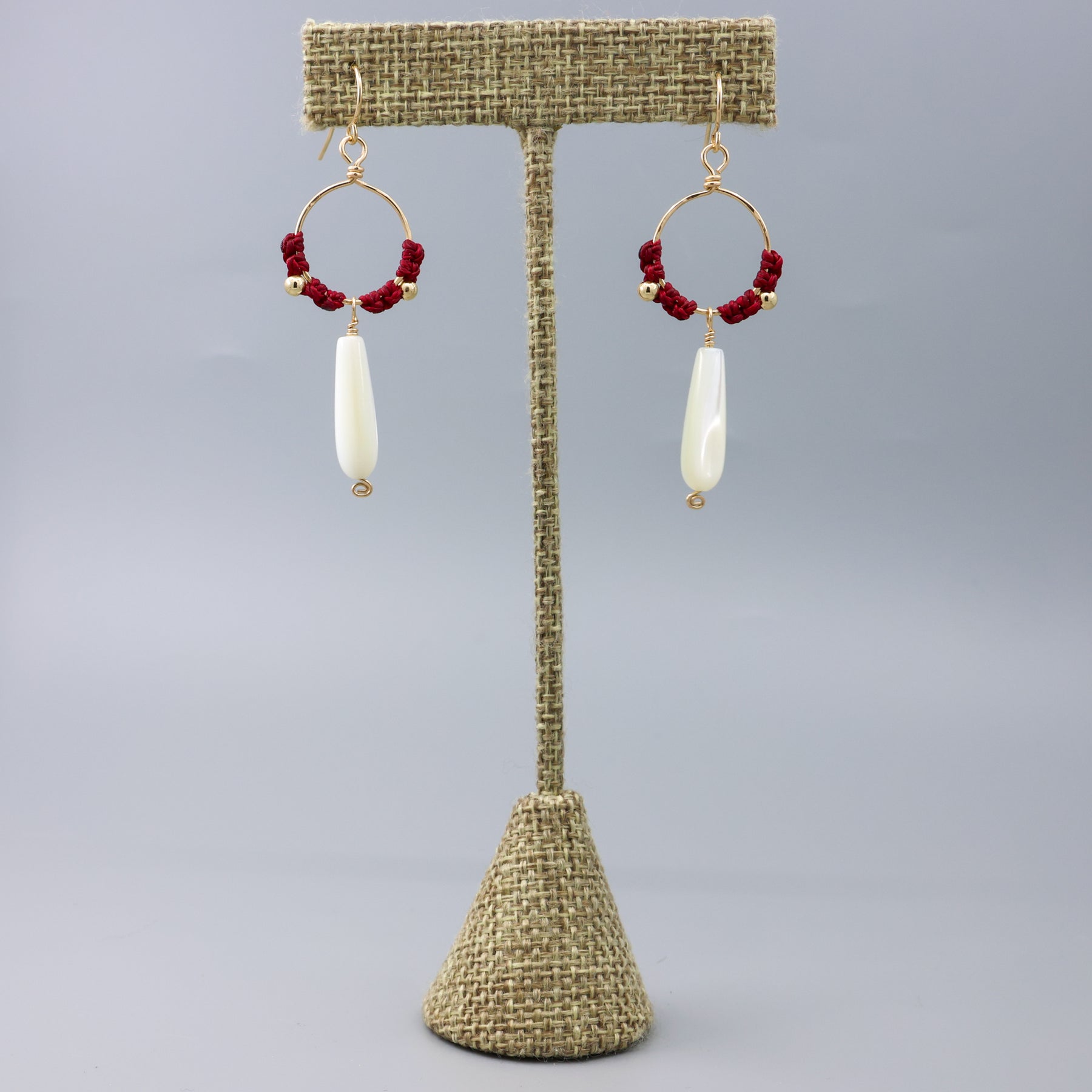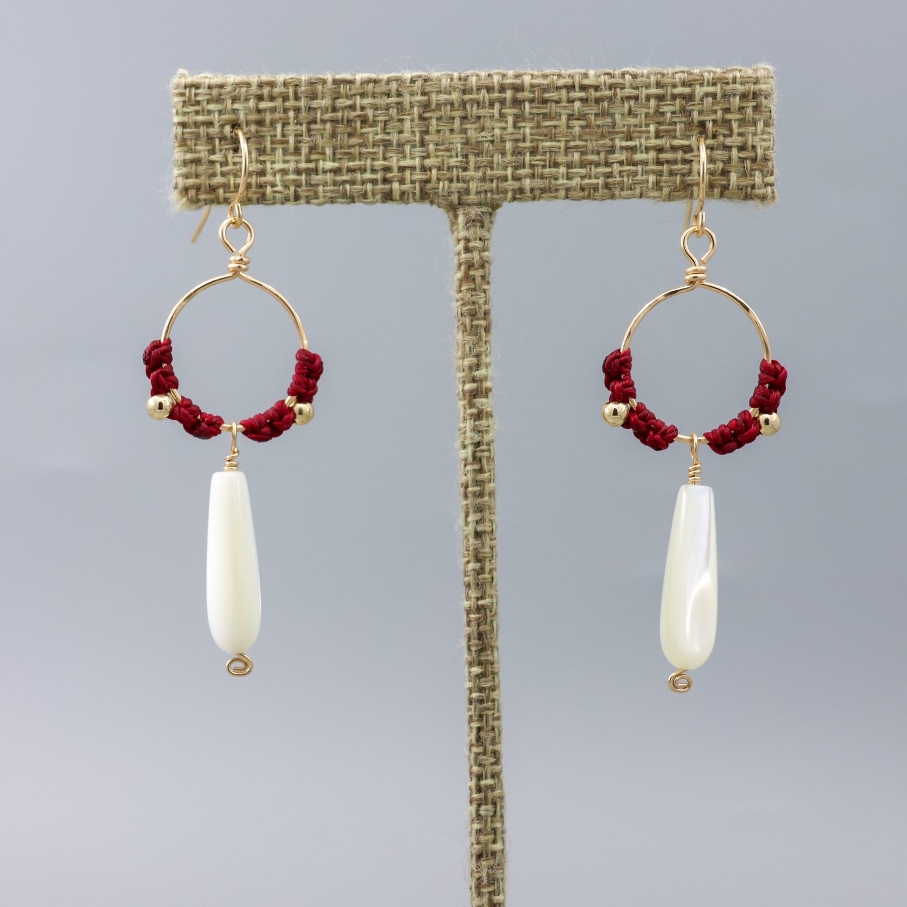 Elevate your inner warrior princess with our Paloma Hoop Earrings. These handmade hoop earrings feature stunning mother-of-pearl teardrop beads paired with delicate red macrame and high-quality 14k gold fill. Make a statement and embrace your strength with these macrame earrings.