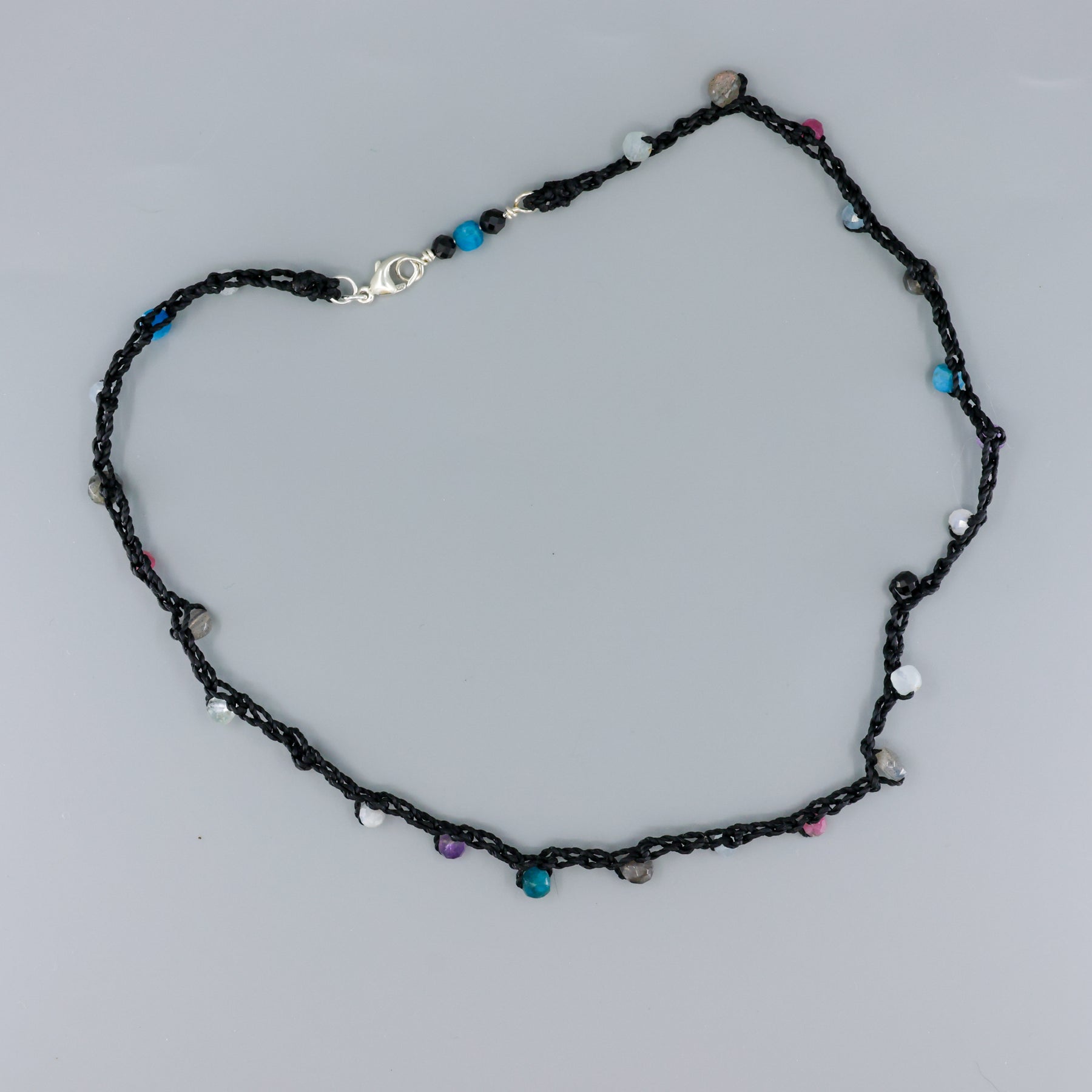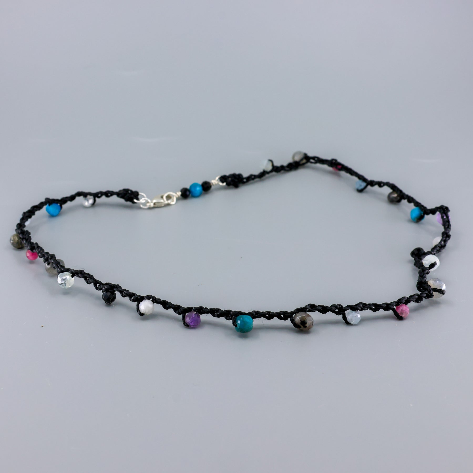 Add a pop of color to your outfit with this fun Night Sky Crochet Necklace! Handmade with star colored gemstones, including moonstone, labradorite, apatite, aquamarine, pink tourmaline, and black spinel, this quirky and playful bracelet is the perfect accessory for lovers of the night sky. Sterling silver clasp.