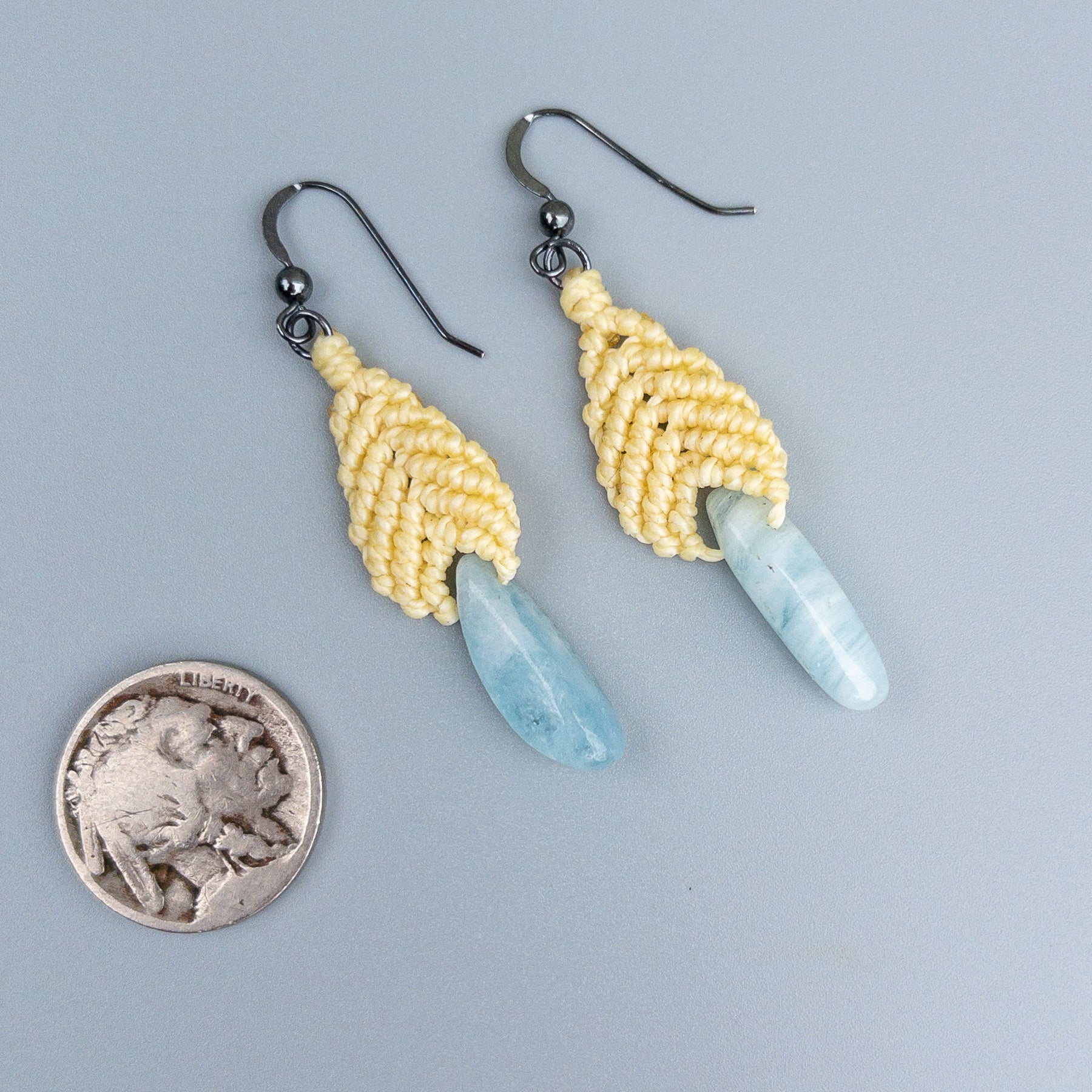 Hand-made, micro-macrame earrings with a leaf-shaped design in a pale yellow and finished with aquamarine beads.