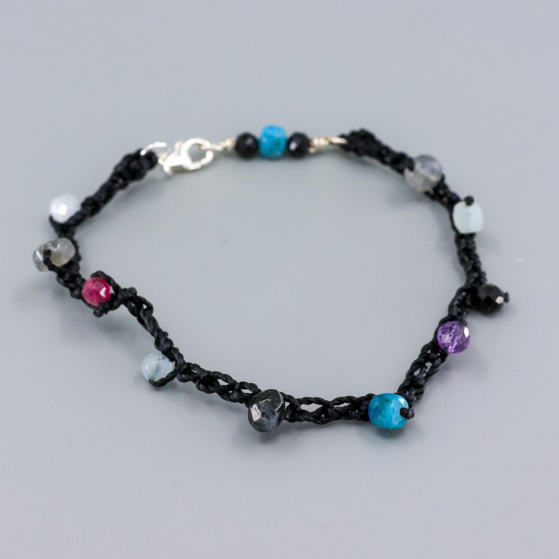 Add a pop of color to your outfit with this fun Night Sky Crochet Bracelet! Handmade with star colored gemstones, including moonstone, labradorite, apatite, aquamarine, pink tourmaline, and black spinel, this quirky and playful bracelet is the perfect accessory for lovers of the night sky. Sterling silver clasp.