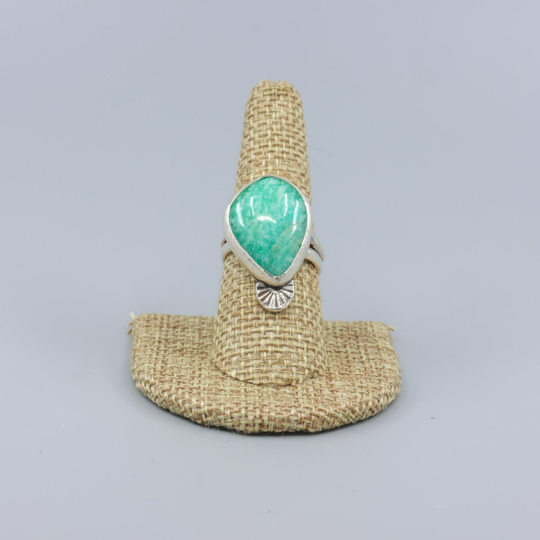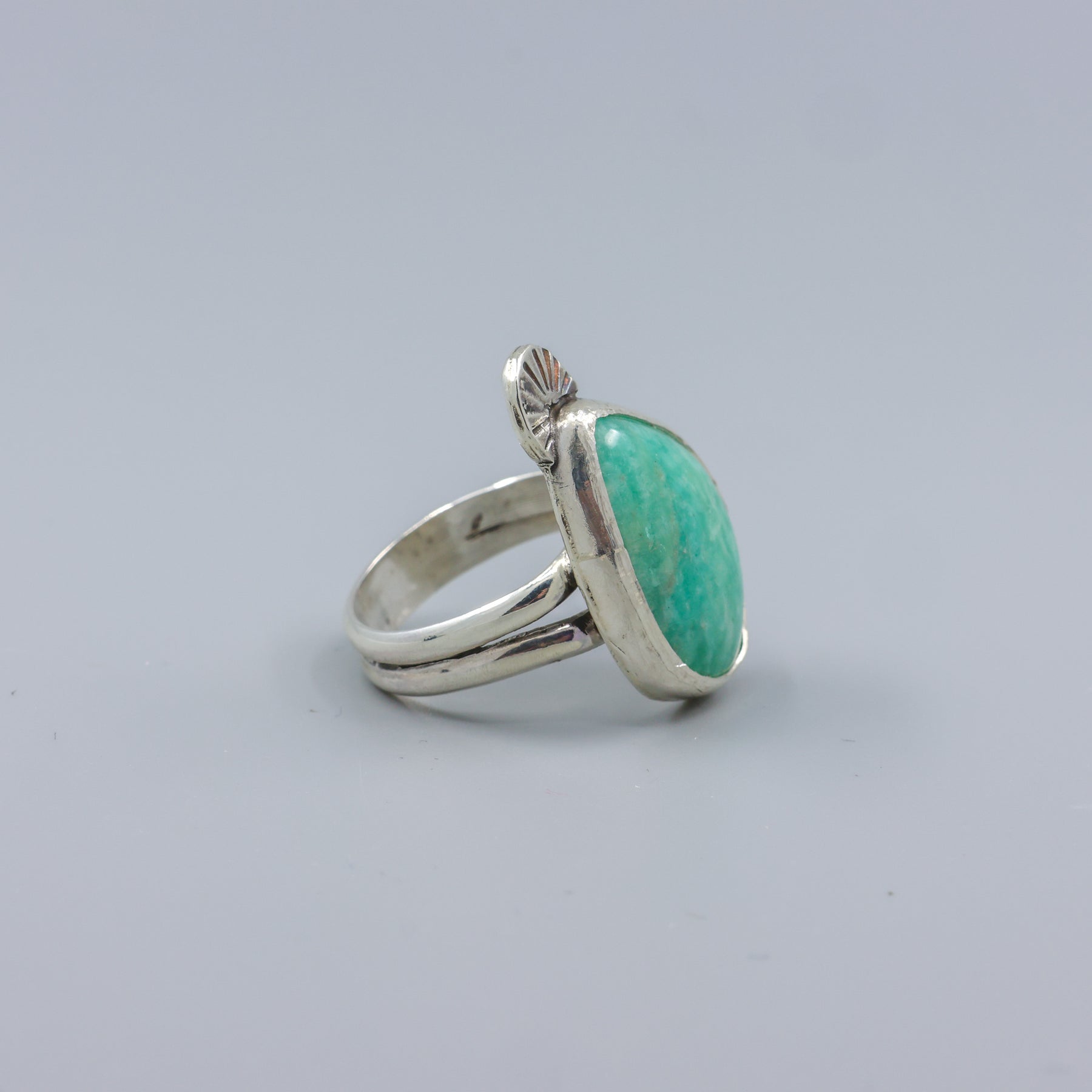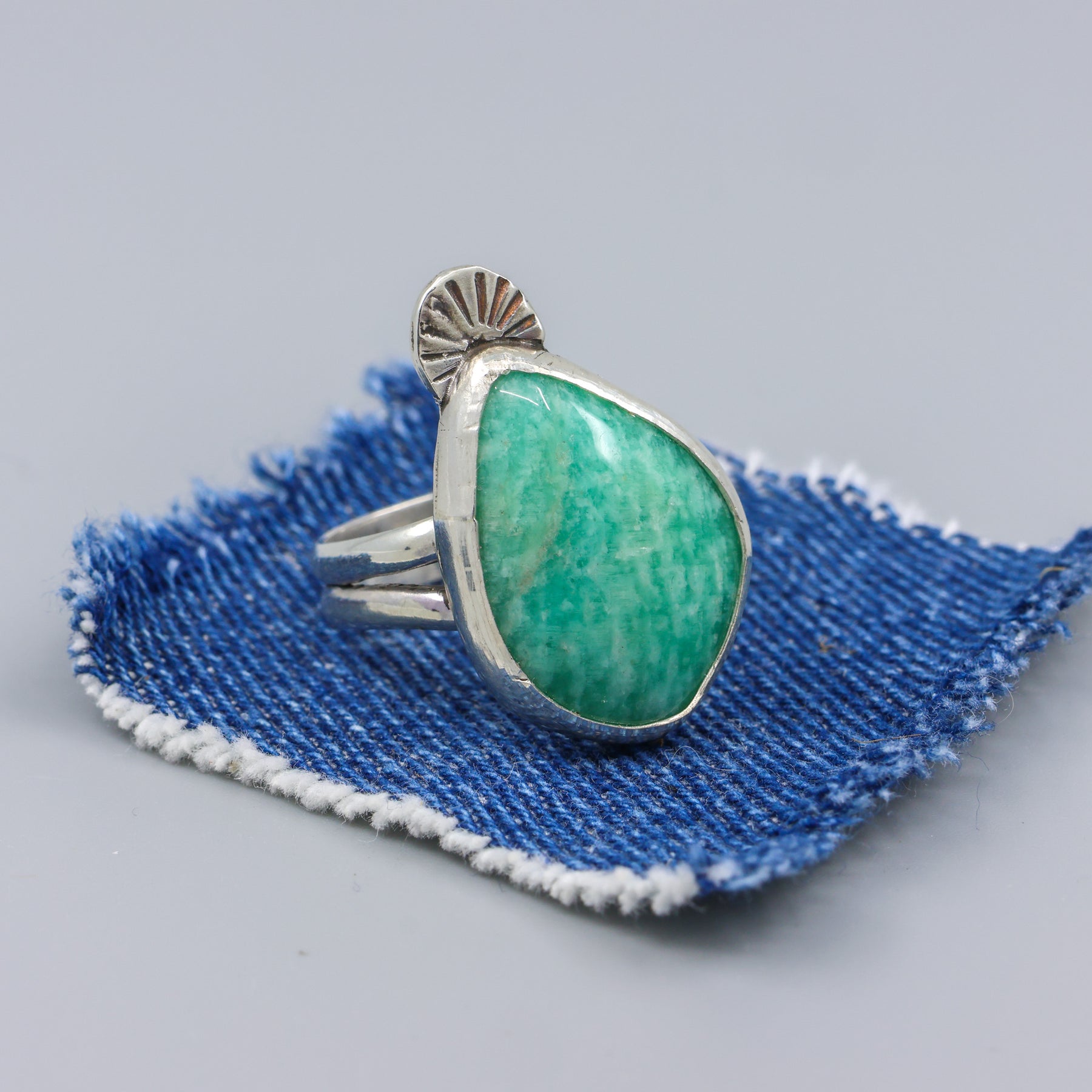 This unique Amazonite Sterling Silver ring features an organic oval cabochon on a hand-stamped sterling silver base and double split ring shank. Own a one-of-a-kind piece and elevate your style.