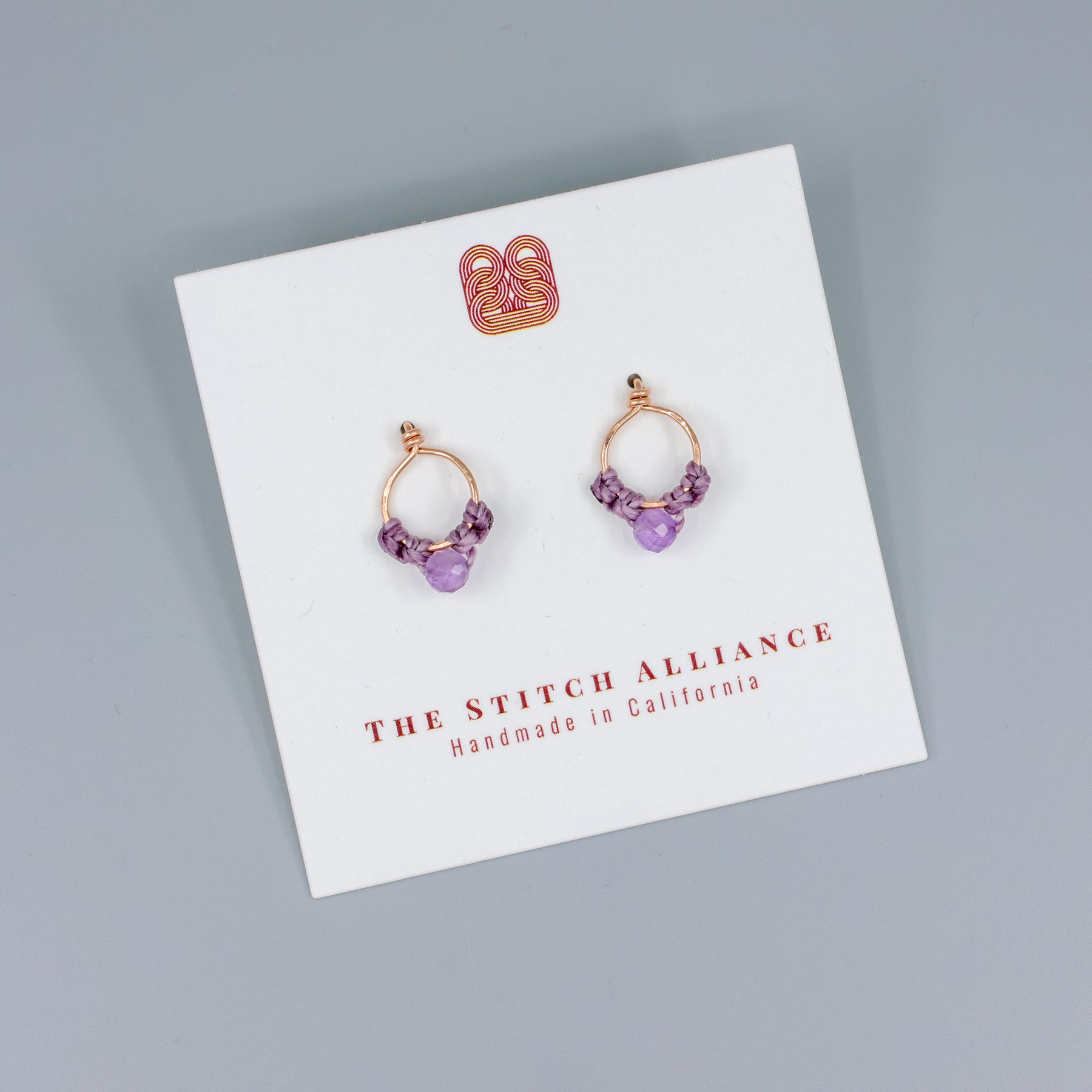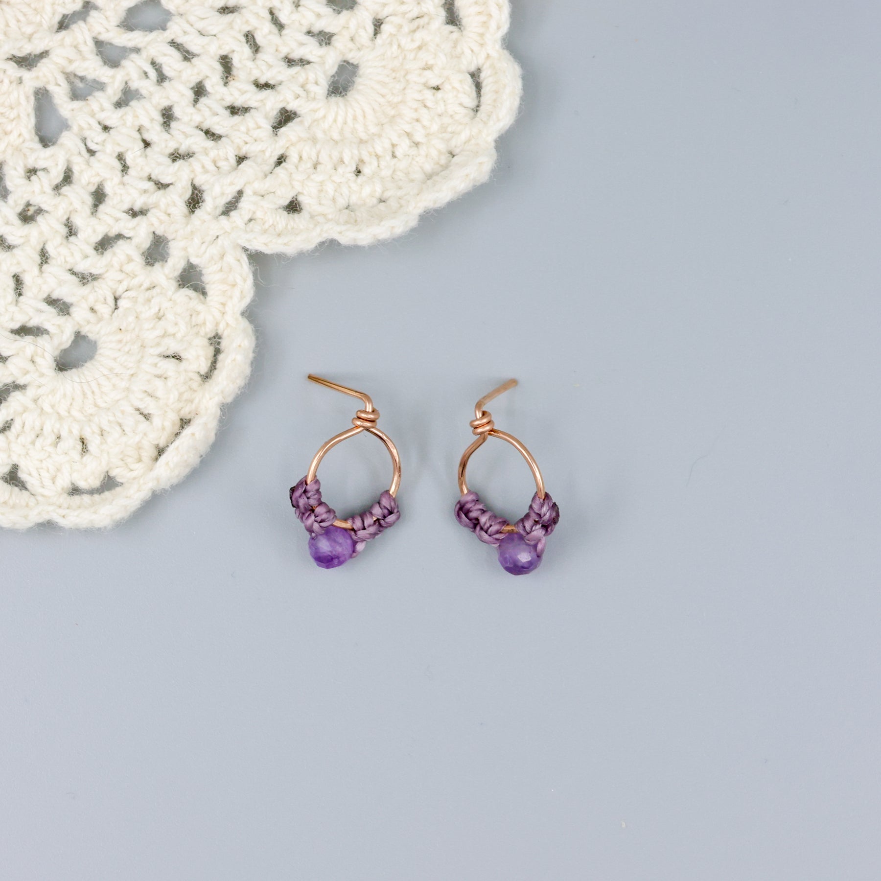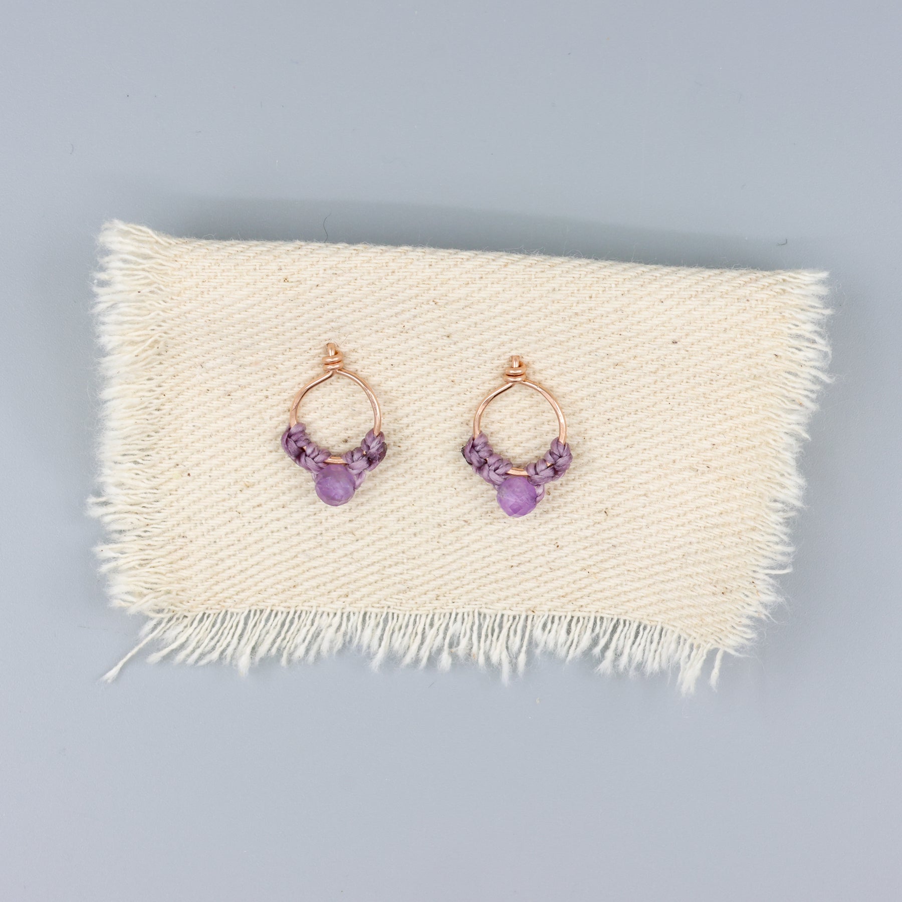 These minimal, rose gold macrame stud earrings will become your new daily faves. They feature delicate macrame on a hammered rose gold-filled circle with an amethyst bead.Â