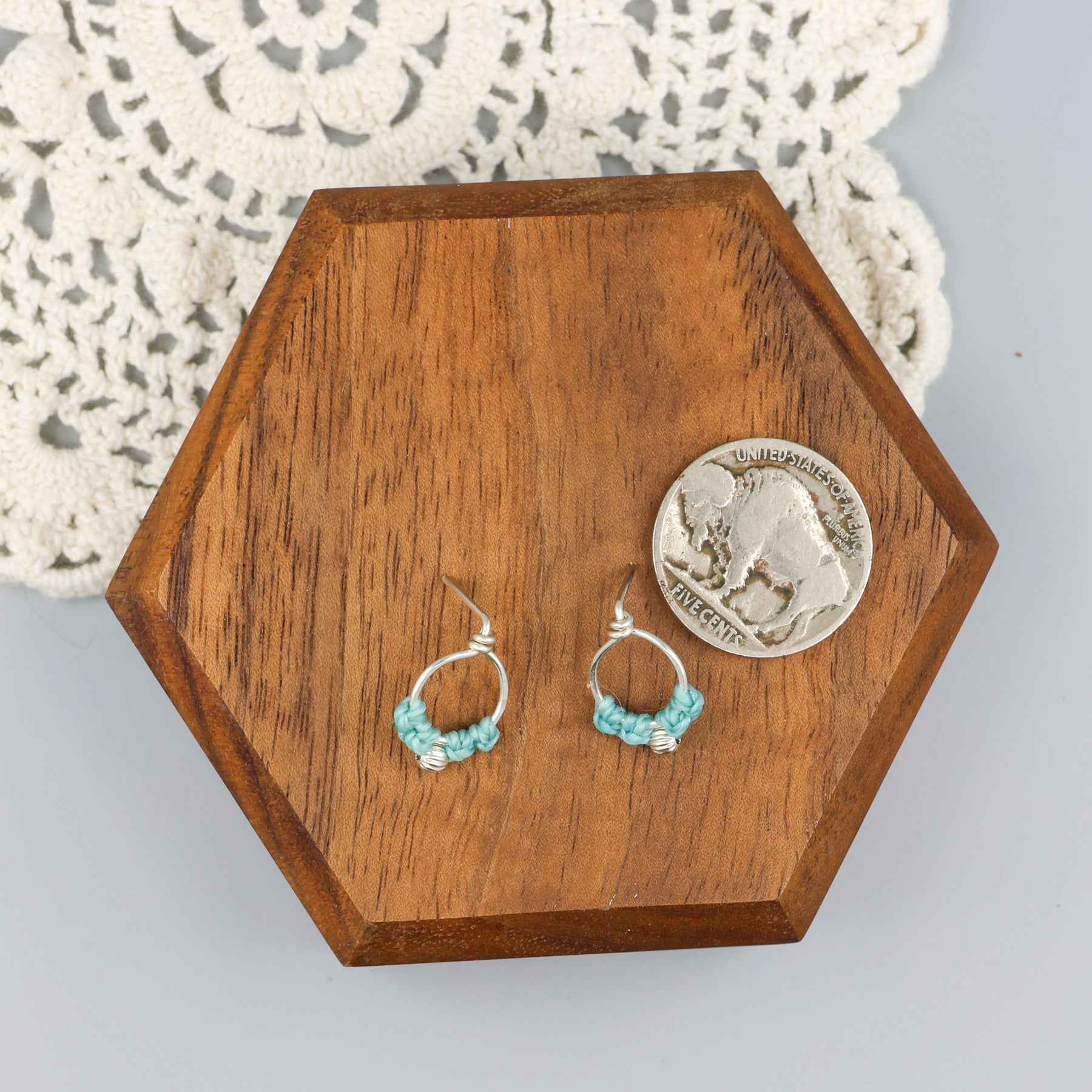 These minimal, blue macrame stud earrings will become your new daily faves. They feature delicate macrame on a hammered sterling silver circle with a sterling bead.